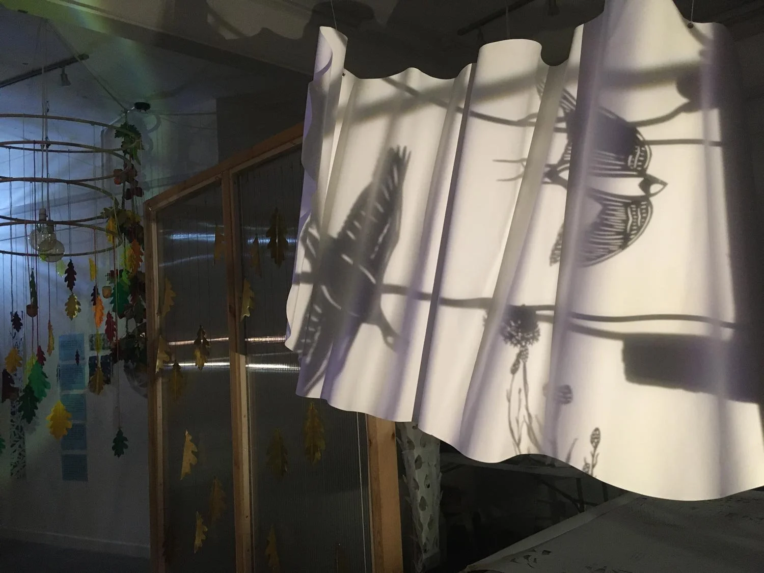 I was interested in using the large gallery space and windows to create work that played with ephemeral light, space and interaction, to engage in the planting scheme ‘Grey to Green’ just outside the venue, to use the windows as an opportunity to share practice with members of the public.