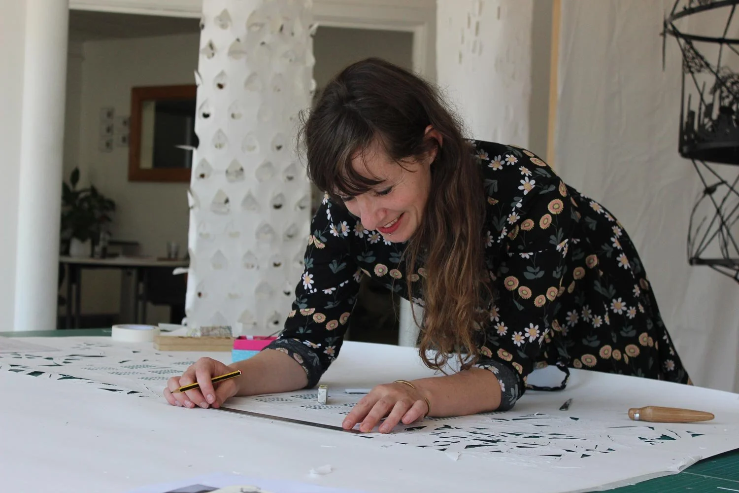 Testing Ground is a micro-residency at Exchange Place Studios, intended to provide an intensive period of creative experimentation for an artist based in Sheffield. As the first Testing Ground artist-in-residence in September and October 2023, I used the gallery as a working studio space to explore light, shadow, paper and storytelling. Over the two month I created a series of hanging papercut artworks and kinetic paper sculptures, both inspired by celestial bodies.